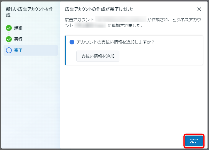 ⑧「完了」をクリックで広告アカウントが作成できました。