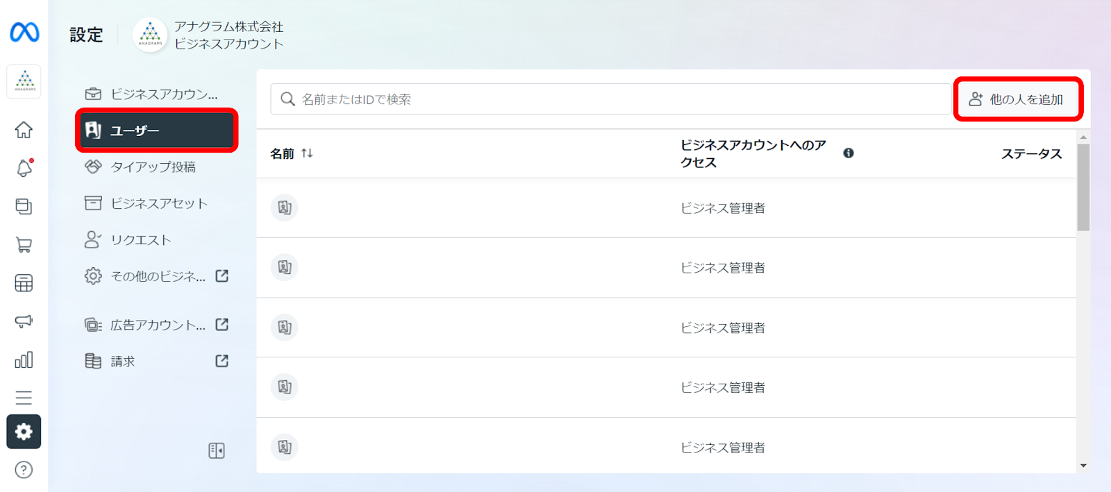 Meta Business Suiteの開設後は、開設者しかアクセスできない状態です。Meta社のツールにアクセスする人が複数いる場合は、ユーザーの登録をしましょう。