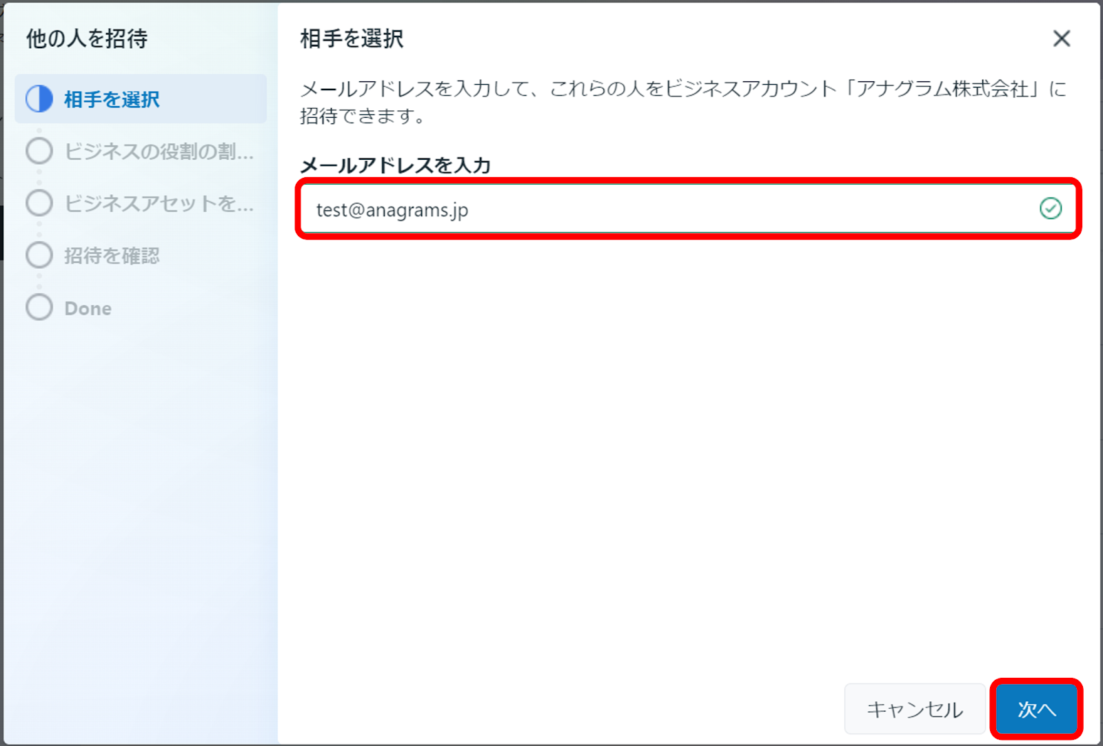 ③招待メールを送るメールアドレスを入力し、「次へ」をクリックします。