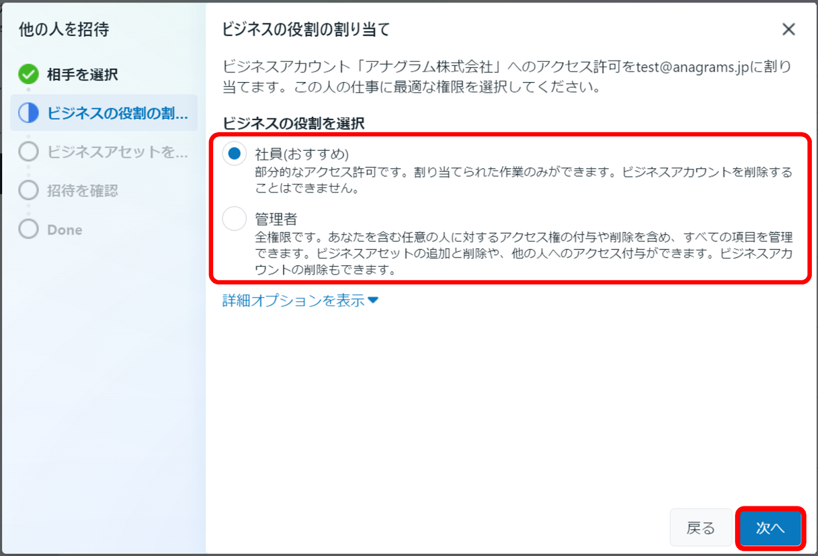 ④「社員」または「管理者」のいずれかの役割を選択し、「次へ」をクリックします。