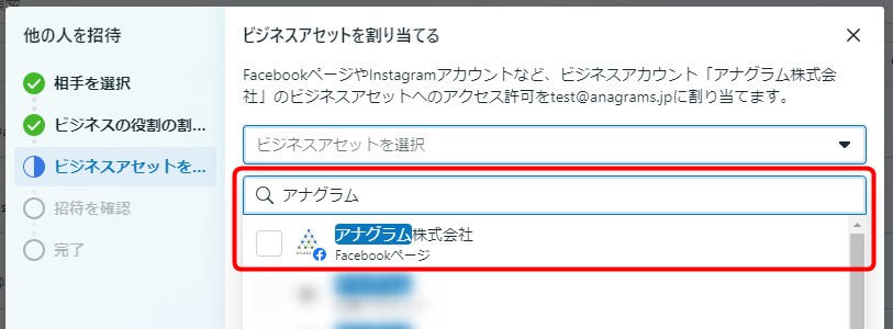 ⑤検索窓にMeta Business Suiteのアカウント名を入力します。Meta Business Suiteに紐づくアセット候補が表示されるのでアクセス許可を割り当てたいアセットをすべて選択します。