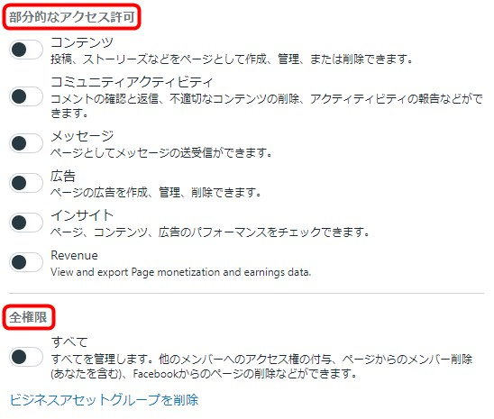 アクセス許可の方法は2つです。個別の操作ごとにアクセスを許可する「部分的なアクセス許可」と、すべての操作へのアクセスを許可する「全権限」です。項目ごとに操作可能な範囲について説明がついていますので、説明を見ながらユーザーごとに適したアクセス許可を割り当てましょう。