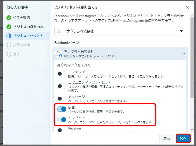 これをすべてのアセットで繰り返し、選択したアセットすべてにアクセス許可の割り当てが終わったら「次へ」をクリックします。