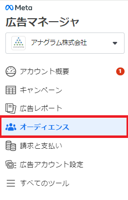 広告マネージャを開き、画面左の「オーディエンス」を選択します。