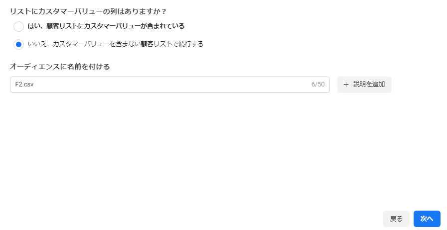 カスタマーバリューの有無を設定し、「次へ」をクリックすると顧客リストのアップロードが開始します。
