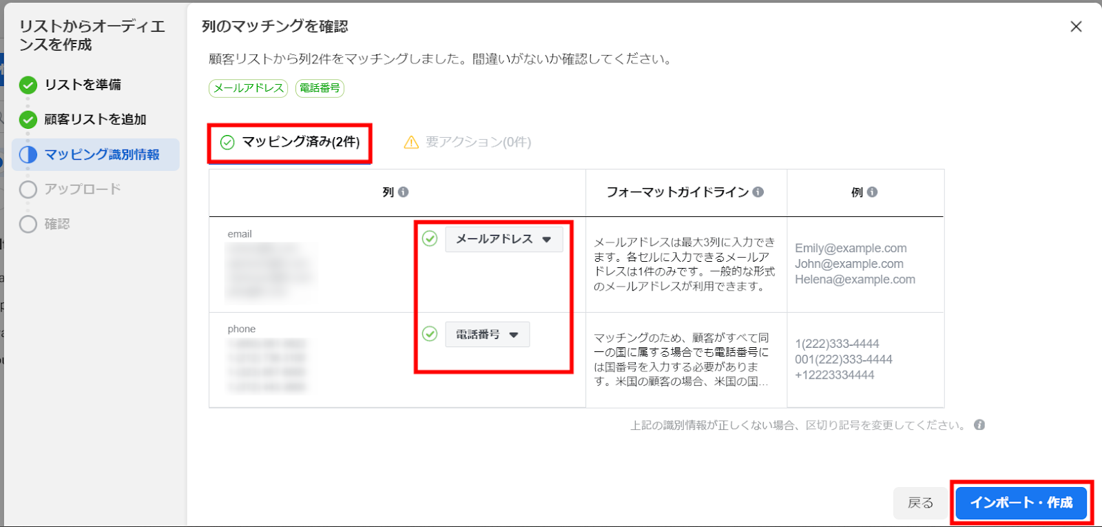 なお、プライバシー保護の観点から、100人以上のリストを作成できるよう注意が必要です。念のため、列の項目が、アップロードした項目と合っているかを確認しましょう。「インポート・作成」をクリックしたらカスタマーリストカスタムオーディエンスの作成は完了です。