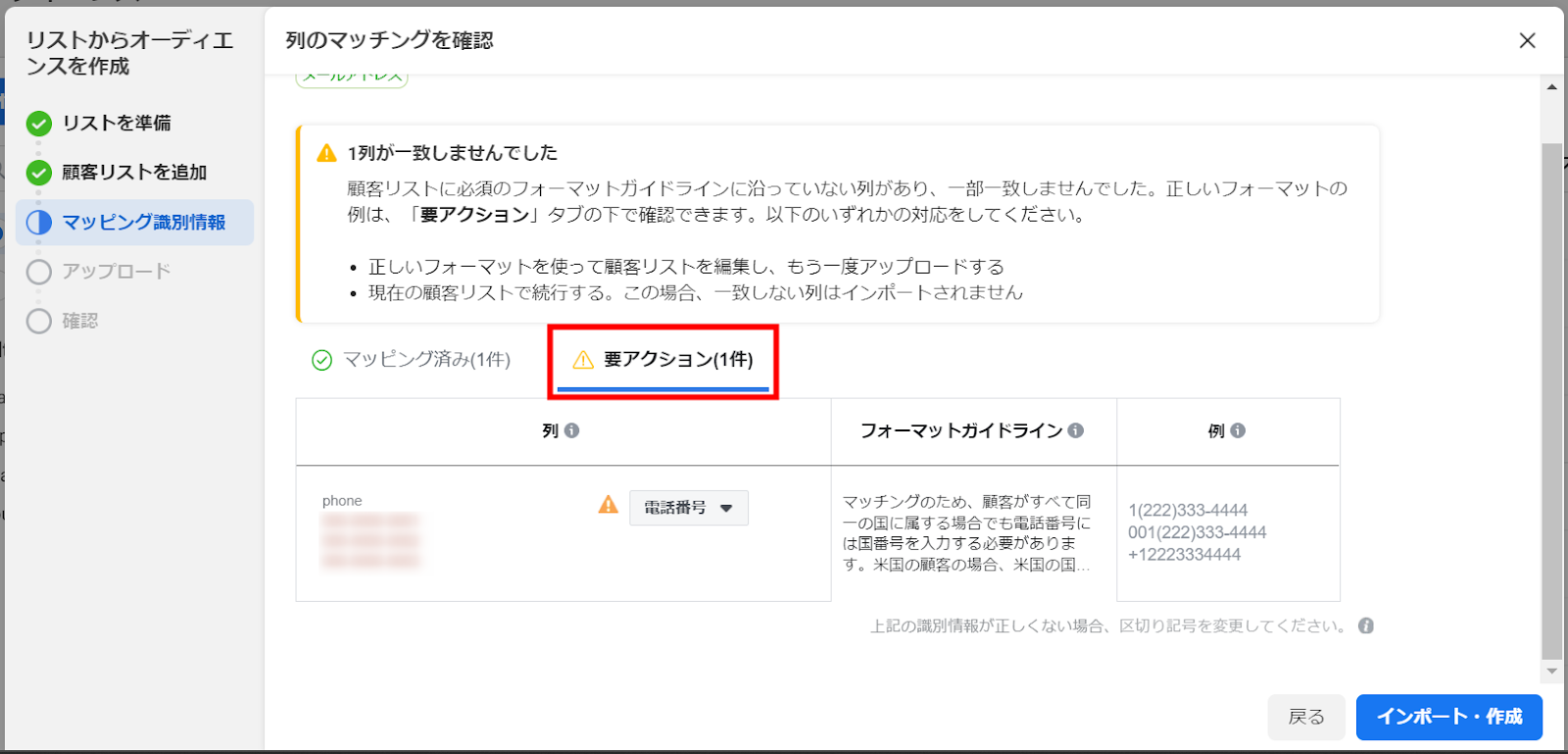 もし「要アクション」がある場合は、アップロードした顧客リストに誤りがある可能性があります。ファイルを修正して再度アップロードしてください。