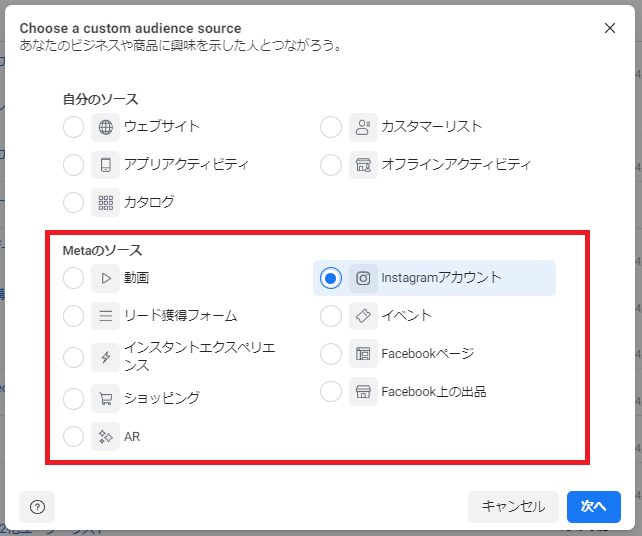 Metaのソースから「Instagramアカウント」を選択します。