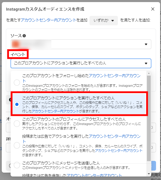 ソースは、広告アカウントで利用しているピクセルを選択してください。イベントのプルダウンから「このプロアカウントのプロフィールにアクセスしたすべての人」を選択します。