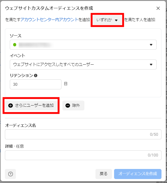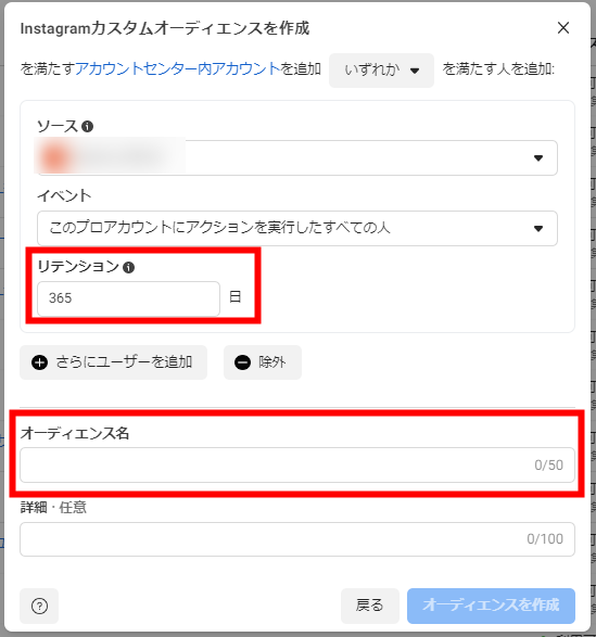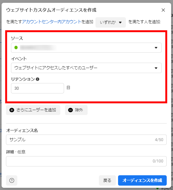 「ソース」は、広告アカウントで利用しているピクセルを選択してください。「イベント」ではユーザーを絞り込むための条件を設定、「リテンション」ではイベントの有効期間を入力します。