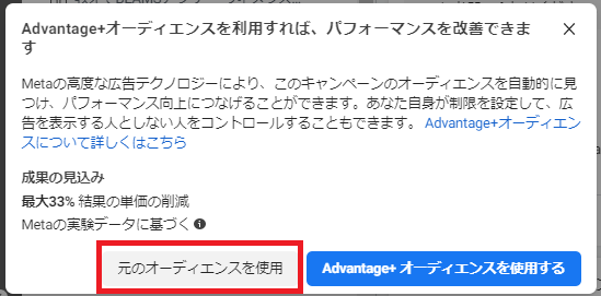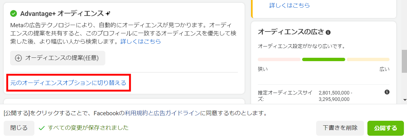 ②「Advantage+オーディエンス」項目の「元のオーディエンスオプションに切り替える」を選択します。