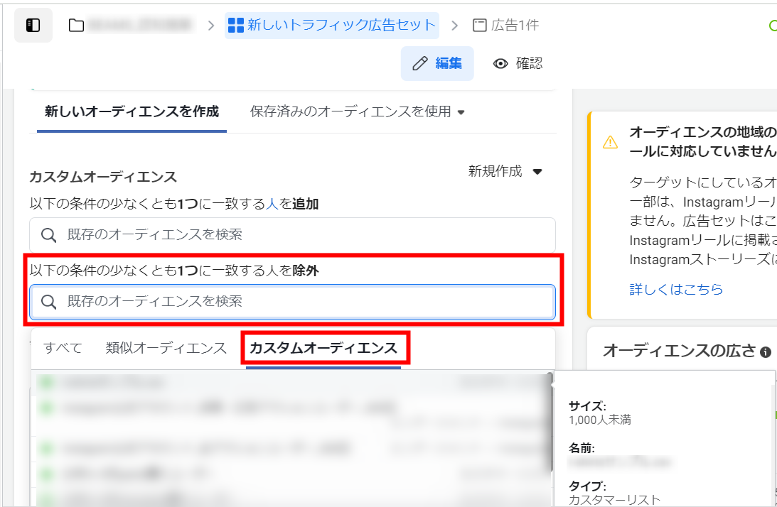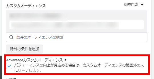 次に、配信対象から特定のカスタムオーディエンスを除外する方法を紹介します。