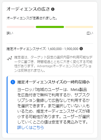 実際に十分な配信ができないときには、広告セットの設定画面で、推定のオーディエンスサイズを確認しましょう。