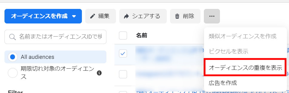 広告マネージャーの「オーディエンス」を開き、比較したいオーディエンスの横にあるボックスにチェックを入れ、「…」より「オーディエンスの重複を表示」を選択するとオーディエンスの重複度を確認できます。