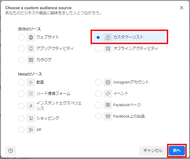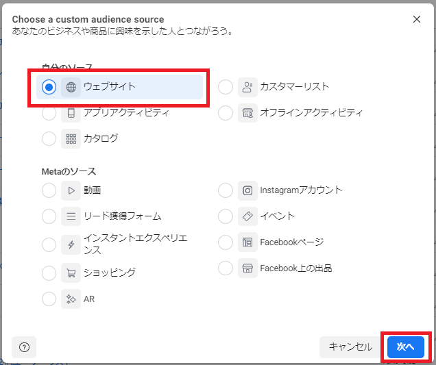 ウェブサイトカスタムオーディエンスを作成する場合は「ウェブサイト」を、アプリアクティビティカスタムオーディエンスを作成する場合は「アプリアクティビティ」を選択して「次へ」をクリックします。