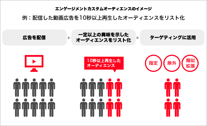 さまざまなエンゲージメントをもとにオーディエンスへ広告を配信できると施策の幅が広がりますよね。では実際にどのような活用方法が考えられるか見ていきましょう。