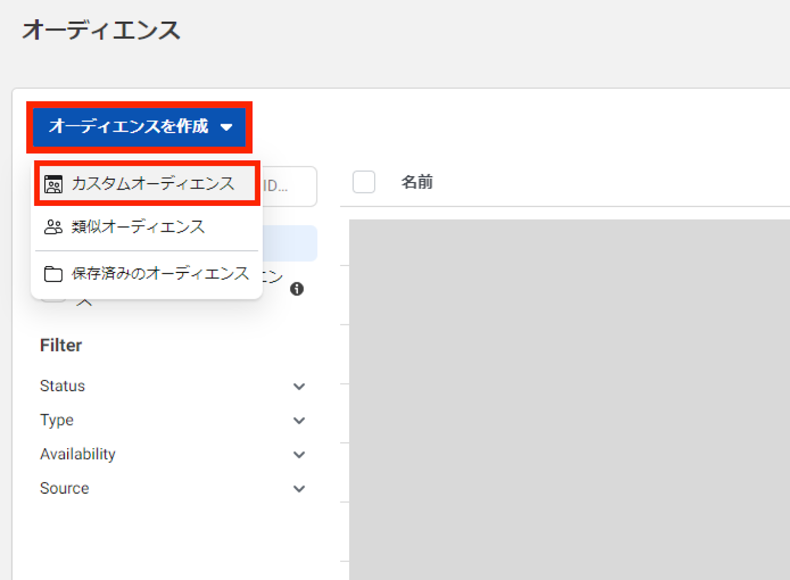 広告マネージャーを開き、オーディエンス画面の「オーディエンスを作成」から、「カスタムオーディエンス」を選択します。