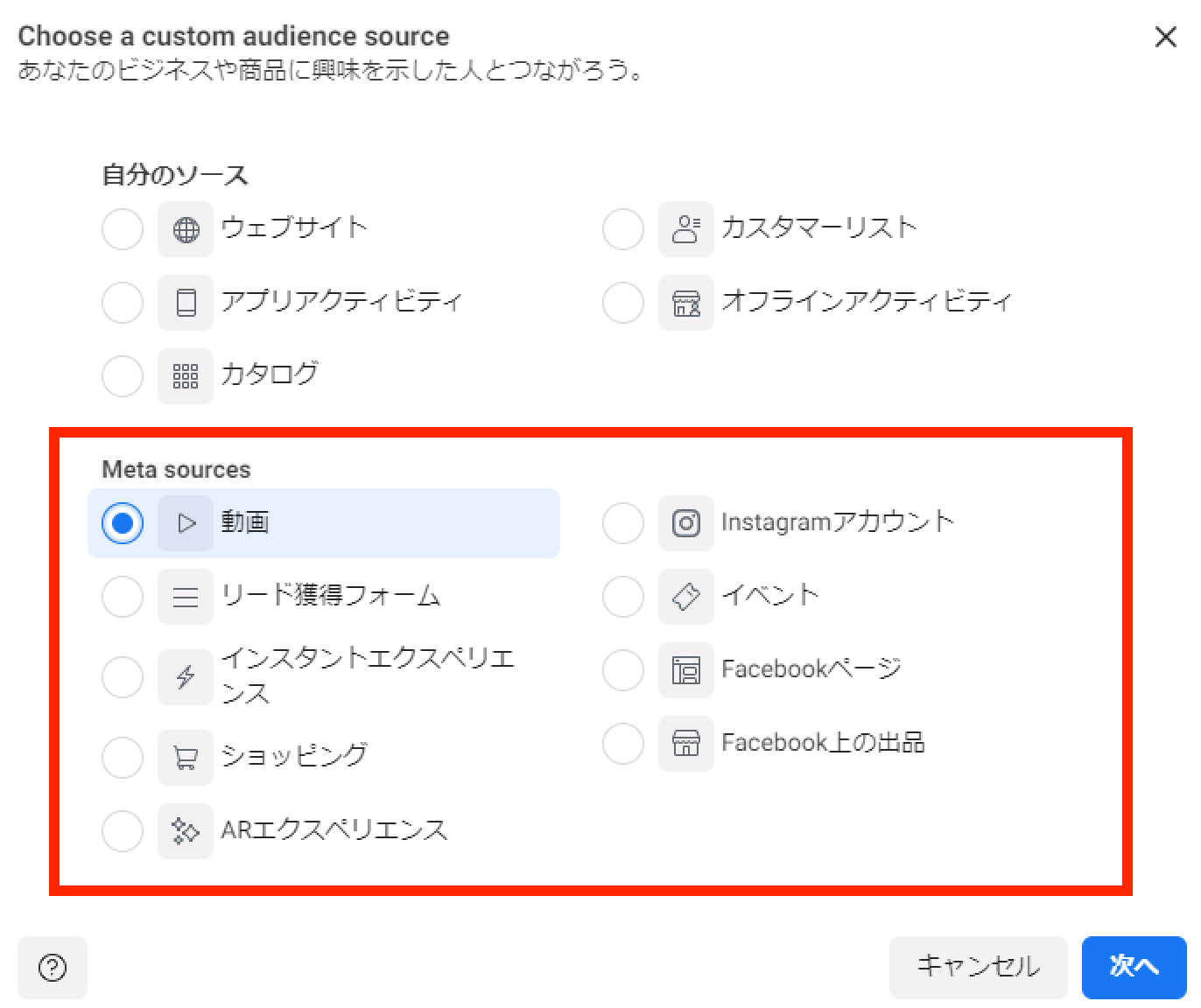 FacebookまたはInstagramのオーガニック動画や動画広告を再生した人にもとづくカスタムオーディエンスです。
