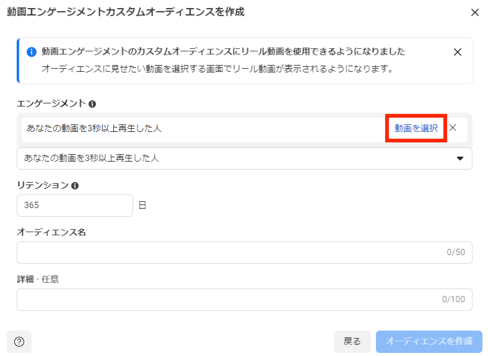 参考:動画エンゲージメントカスタムオーディエンスを作成する|Meta ビジネスヘルプセンター