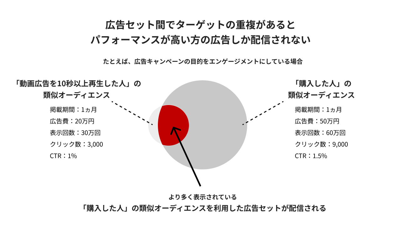もし「購入した人」の類似オーディエンスを利用している広告セットのパフォーマンスの方が高ければ、「動画広告を10秒以上再生した人」の類似オーディエンスを利用した広告セットは配信されない可能性があります。せっかく設定を進めたのに全く配信出なかったなんてことが起きないように、「購入した人」の類似オーディエンスを利用している広告セットから「動画広告を10秒以上再生した人」の類似オーディエンスを除外したり、広告セットを統合するなどを行うと良いでしょう。