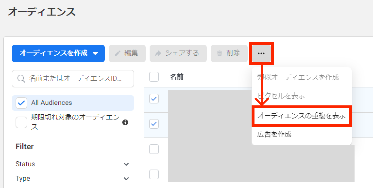 比較したいオーディエンスの横にあるボックスにチェックを入れ、「…」より「オーディエンスの重複を表示」を選択するとオーディエンスの重複度を確認できます。