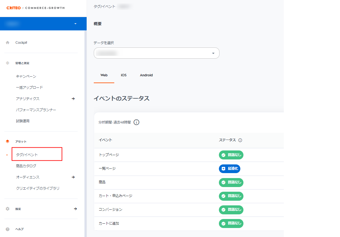Criteoタグのエラー状況は、広告管理画面の左メニューにある「アセット」の「タグ/イベント」より確認できます。発火数の推移に異常がある場合は、速やかに改善策を講じましょう。