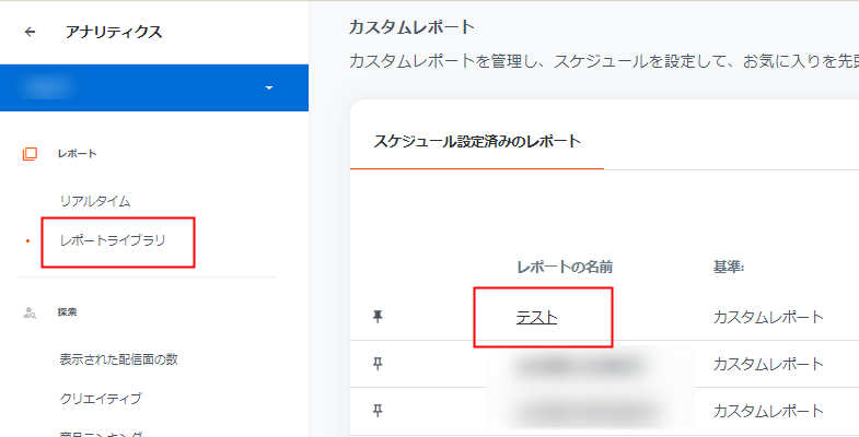 ⑧保存したレポートは、レポートライブラリのカスタムレポートからいつでも確認できます