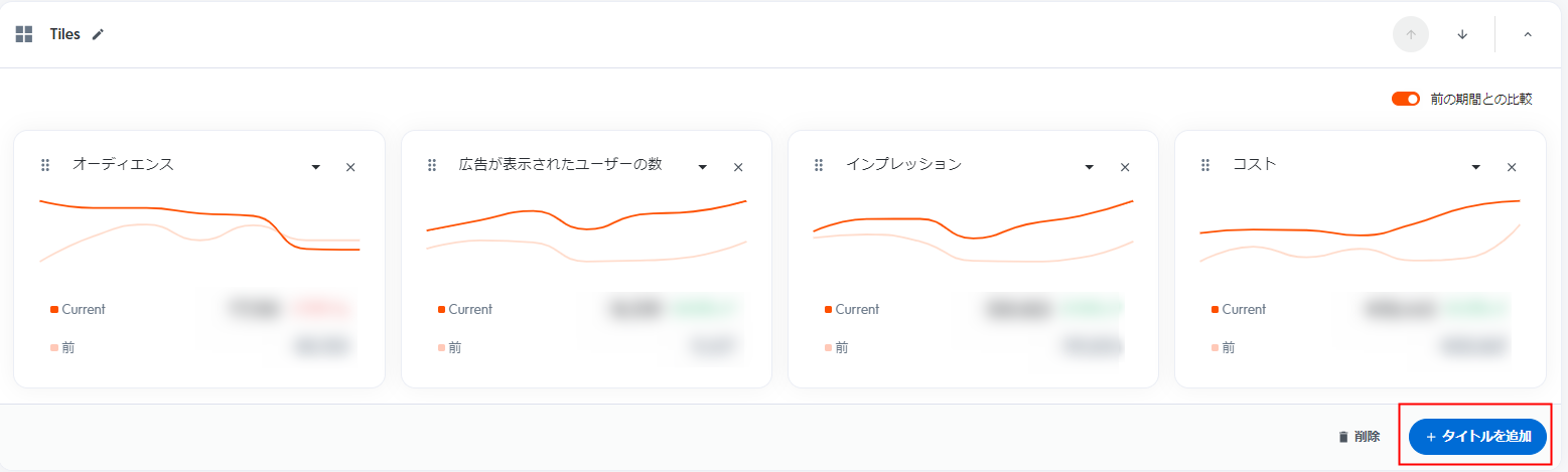 ④「Tiles」で表示させたい指標が4つ以上ある場合は、「+タイルを追加」をクリックして追加しますこの後の手順は、②③と同じです。