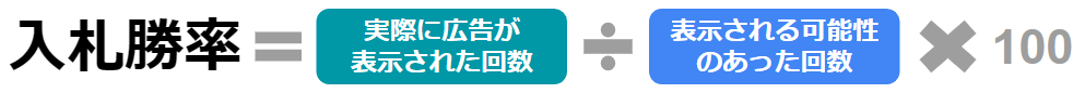 「入札勝率」は、表示される可能性のあった回数に対して、実際に広告が表示された回数の割合(%)です。「インプレッションシェア」と同義の指標です。