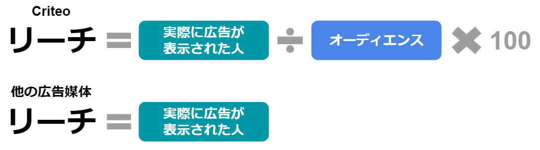 Criteo広告のリーチは、オーディエンスに対して実際に広告が表示されたユニークユーザーの割合(%)になります。