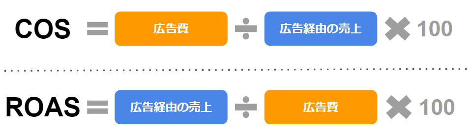 COSは広告費を広告経由の売上から割ったものなので、別名で「売上原価」とも呼ばれます。売上における広告費用の割合を示すため、収益性評価をする際に適した指標です。