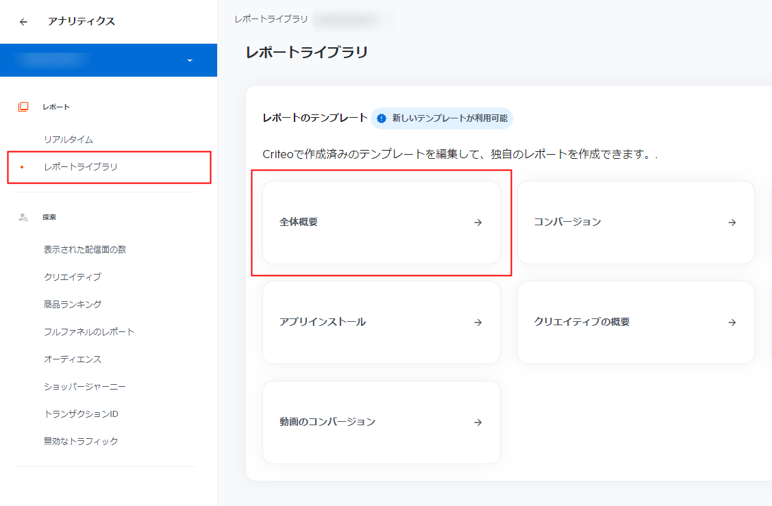 ①管理画面でアナリティクスを開き、「レポートライブラリ」を選択。レポートのテンプレートより「全体概要」をクリックします