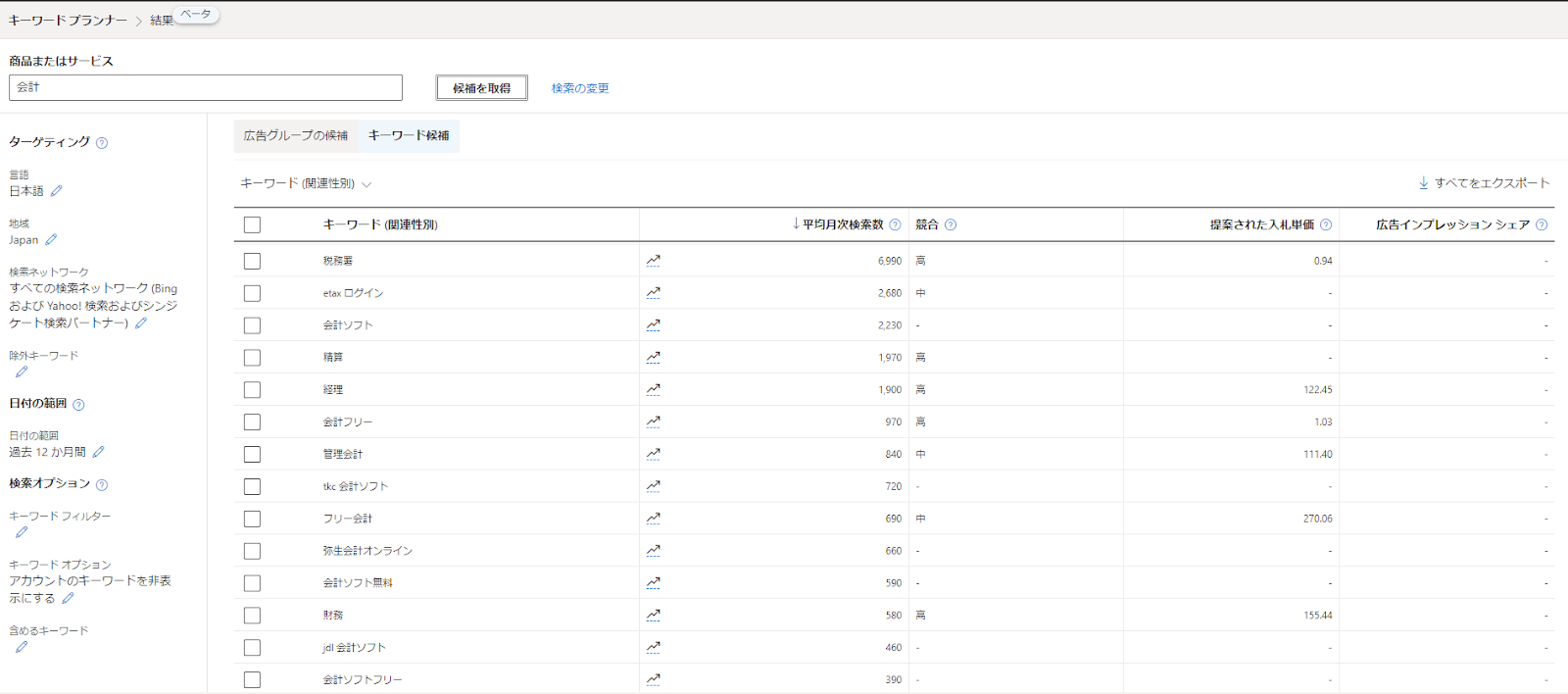 MicrosoftではBtoB向けの商材の検索ボリュームがtoC向け商材よりも比較的多いなどの傾向もありますので、まずが自社商品のカテゴリをキーワードプランナーで調べてみると、新しい発見があるかもしれません。