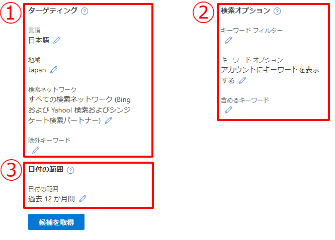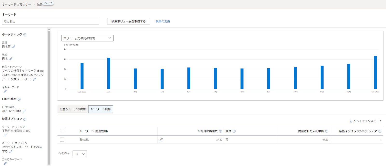 せっかく時間をかけて準備して開始したのに検索ボリュームが思ってたより少なかったとなってしまうのは避けたいですよね。Microsoft広告はリリースされた間もない媒体であるからこそ、配信開始する前に各キーワードのボリュームや相場感を把握することが重要です。