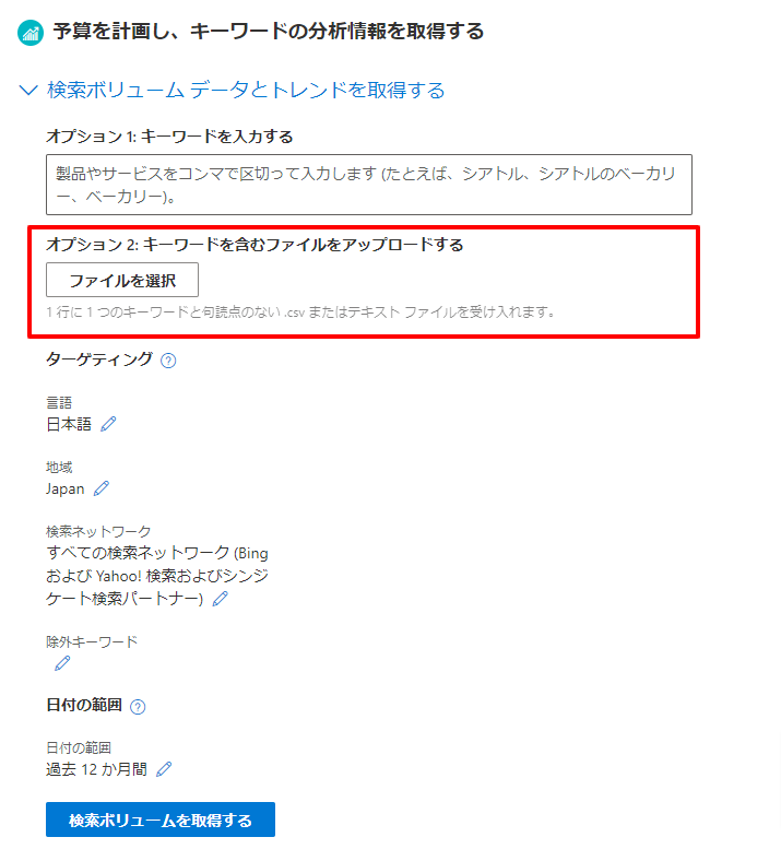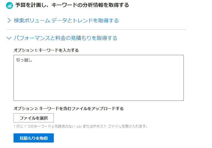 「キーワードを探す」と「検索ボリューム データとトレンドを取得する」とは異なり、データを見積りたいキーワードのみを入力、またはファイルでアップロードします。