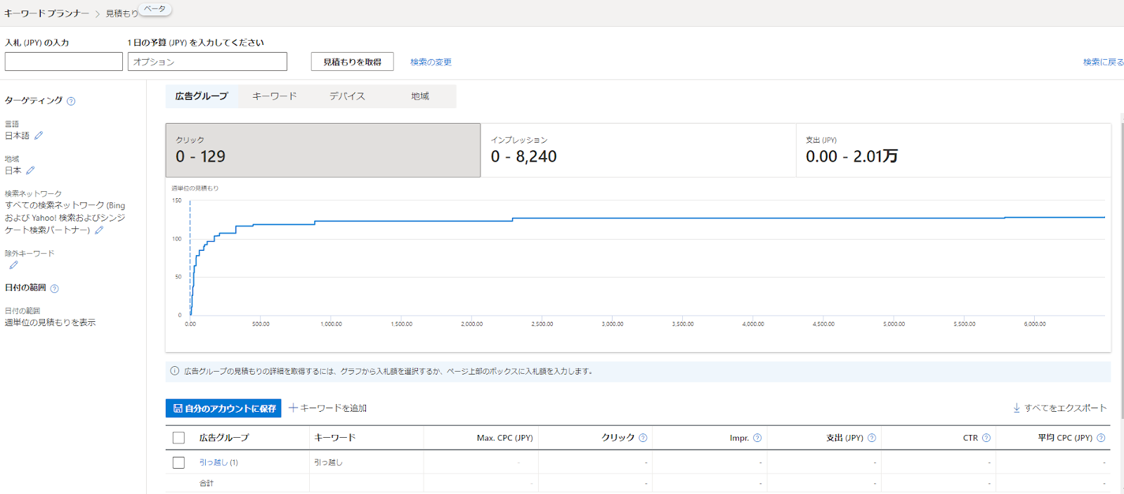 キーワードを入力し、「見積もりを取得」をクリックすると、指定したキーワードを配信した際の想定クリック数、想定インプレッション数、想定広告費を閲覧できます。