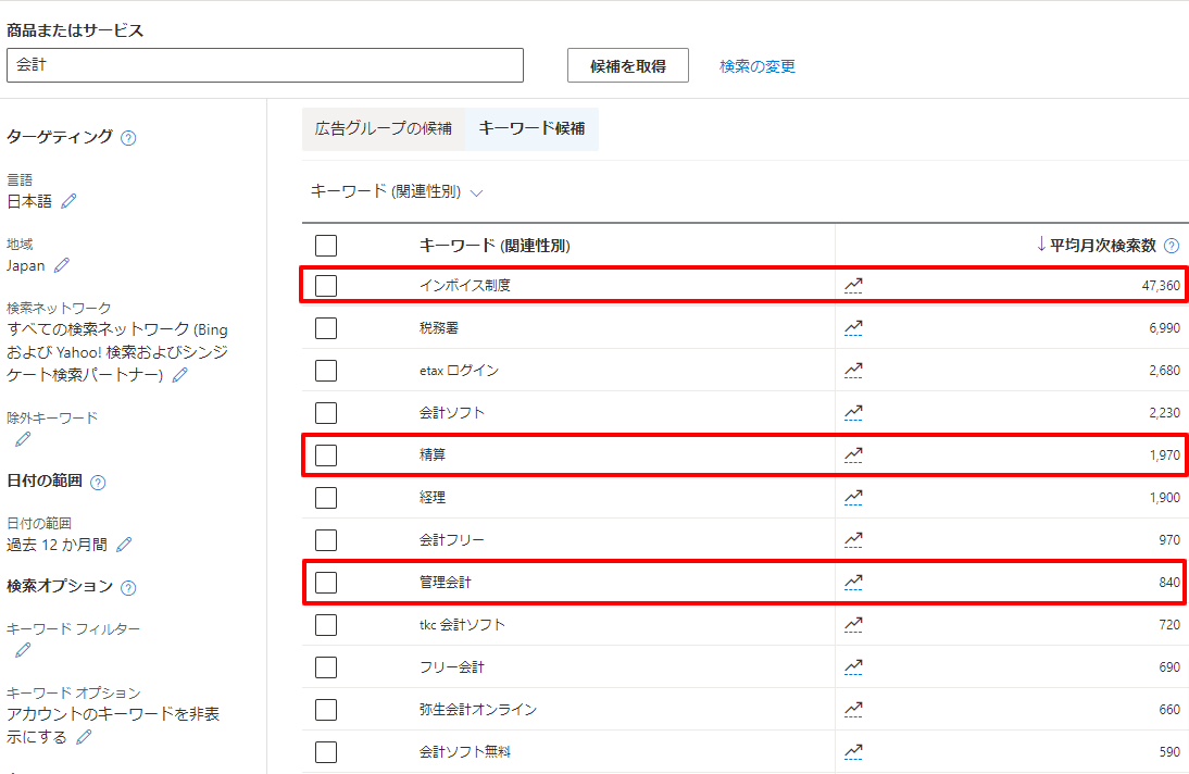 たとえば、クラウド会計ソフトを販売しており、検索広告を検討していた場合、「会計」というキーワードで「新しいキーワードを探す」を使用すると、会計に関連したキーワードが表示されます。「管理会計」や「会計ソフト」といった会計に直結するようなキーワードから、「精算」などの類似語句、「インボイス精度」など関連はするものの別の意味のキーワードまでツールによって提示されます。