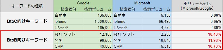 また、Google広告のキーワードプランナーでの検索ボリュームと比較してみると、C向けのキーワードだとGoogleの検索ボリュームに対して数%ほどですが、「会計ソフト」や「名刺」「CRM」といった比較的ビジネスで用いるキーワードだと、Googleの検索ボリュームに対して相対的に検索ボリュームが多いことわかります。