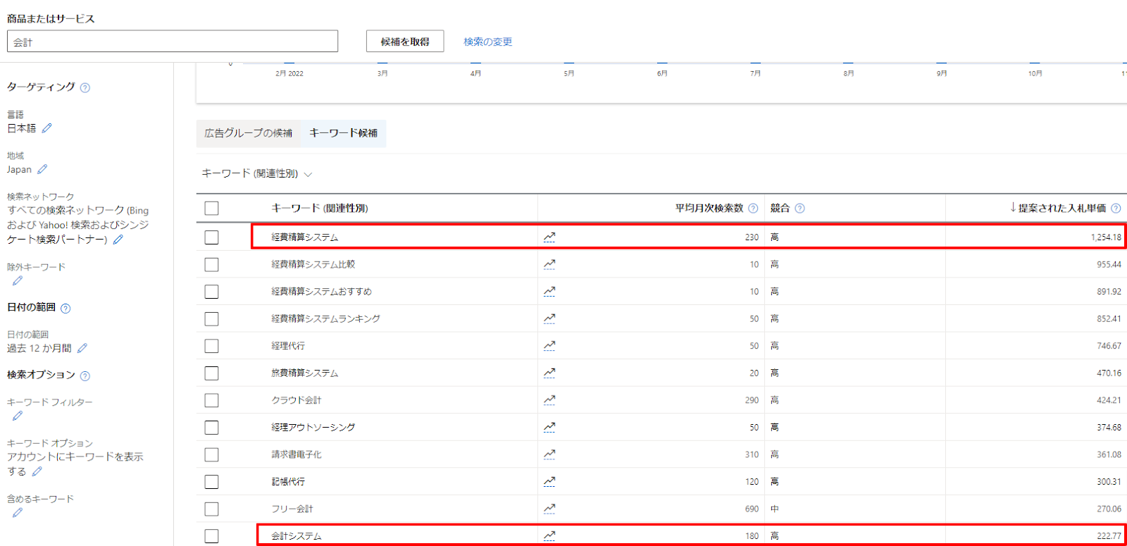 たとえば、「経費精算システム」では1,000円以上の入札単価が提案されていますが、「会計システム」ですと200円ほどです。