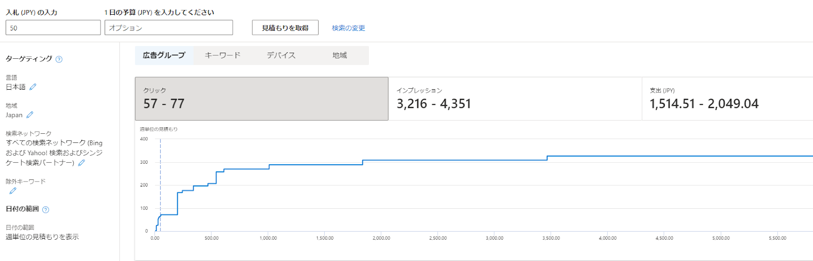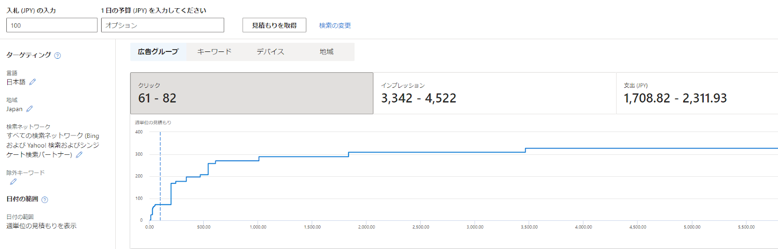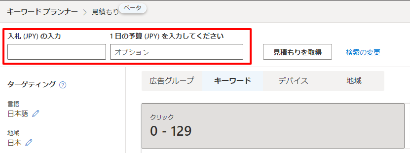 「パフォーマンスと料金の見積もりを取得する」では指定したキーワードを配信した場合の想定値を取得可能と説明しましたが、「入札単価」や「1日の予算」を設定することでより配信する際のイメージに近いデータを取得できます。