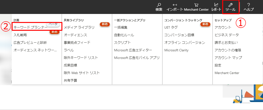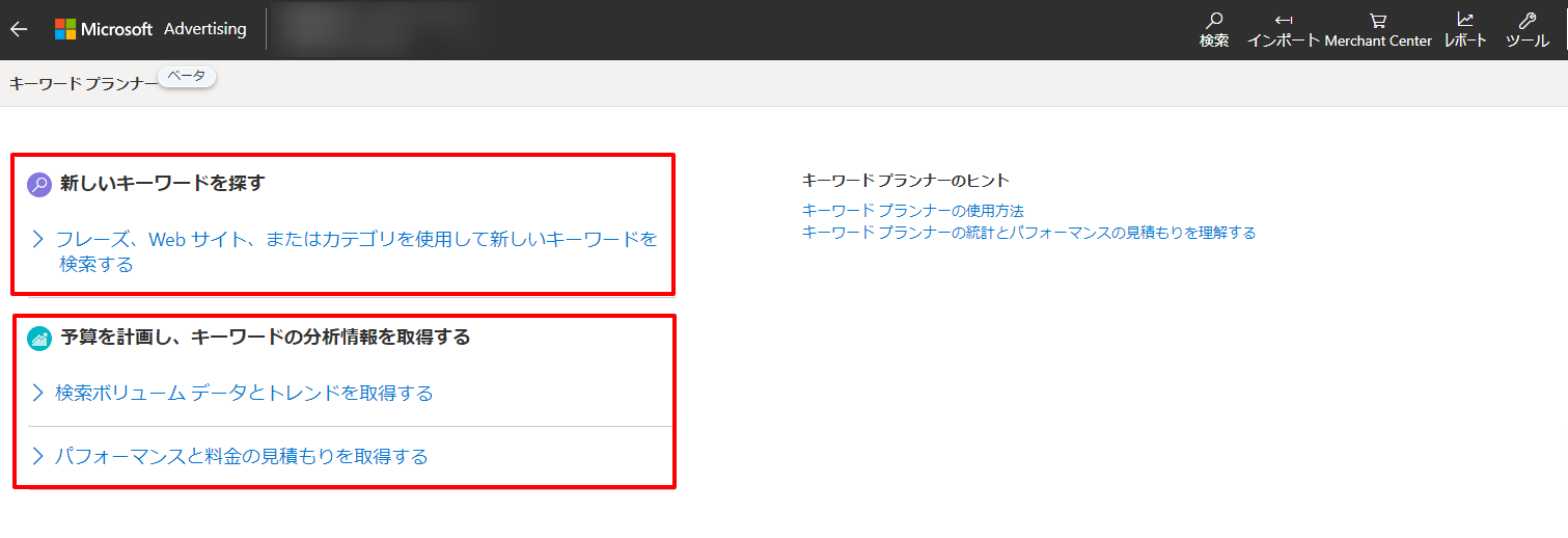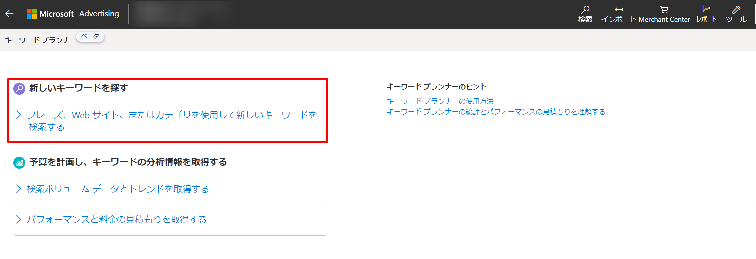 Microsoft Advertisingにサインインができたら、キーワードプランナーにアクセスします。