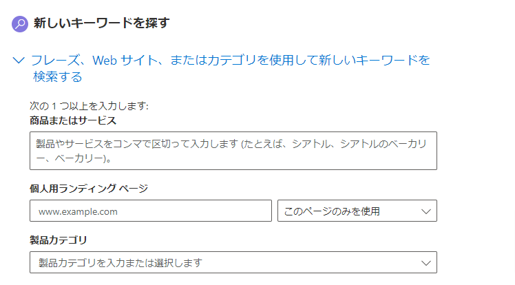 どんなキーワードがビジネスに合っているかがイメージできていなかったり、想定していたキーワードの他に可能性がありそうなものを探す場合にはランディングページを入力したり製品カテゴリから探すのも有効ですね。