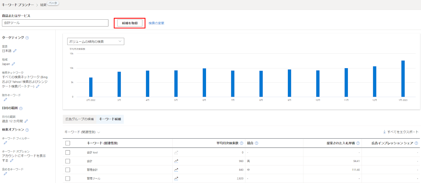 キーワードとターゲティングを指定し、「検索ボリュームを取得する」をクリックします。