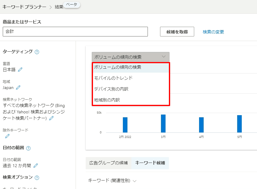 現状ではBingのPC版での掲載がほとんどです。また、地域ごとのデータはキーワードによってはボリュームが少なくて表示がされない場合もあります。そのため最初からあまり絞り過ぎずない状態から確認していくのがおすすめです。