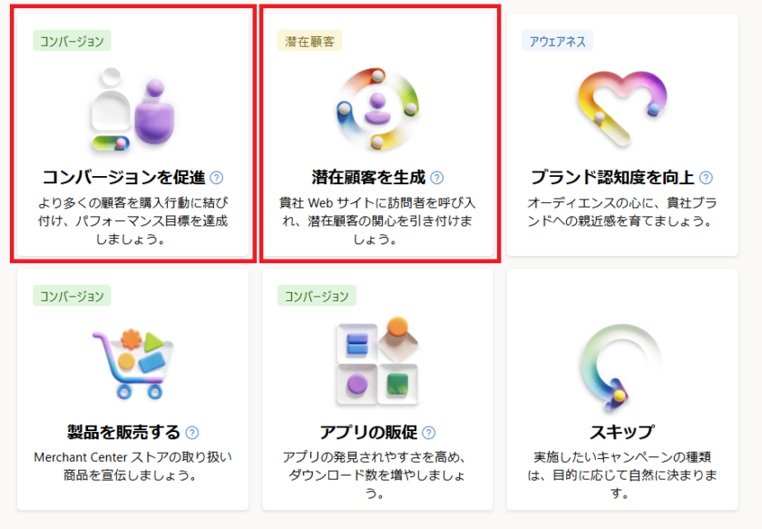 2.キャンペーンの目標に [コンバージョンを促進] または [潜在顧客を生成] を選択します。