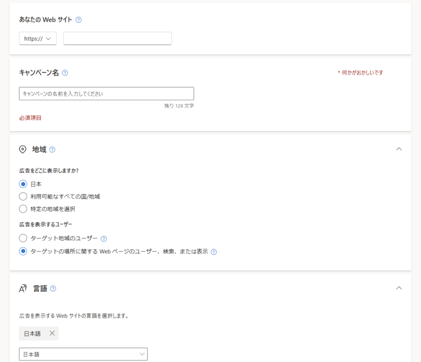4.任意のキャンペーン名とサイトのURLを入力して、配信する地域と言語を設定します。