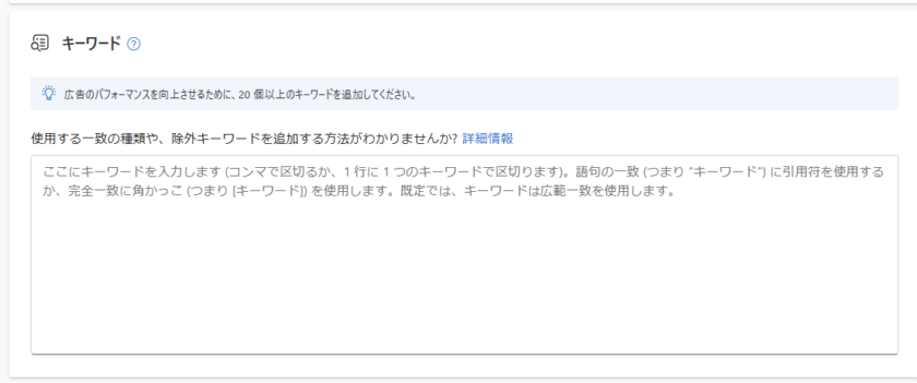 | 説明文 | 〇 | 半角90文字以内 | 広告配置に応じて、長い広告見出しもしくは短い広告見出しの下、または横に表示されます。 |
