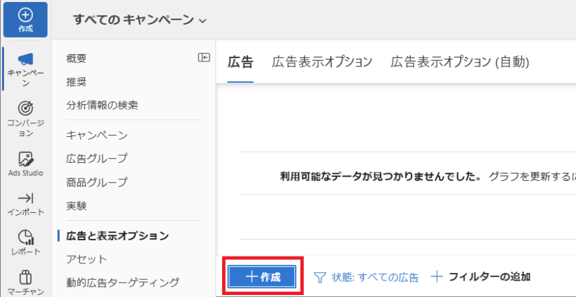 1.管理画面の左側メニューで [キャンペーン]を選び 、 [広告と表示オプション] > [広告]を選択した後に、[広告の作成] をクリックします。