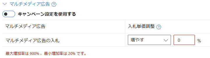 Microsoft広告の他のキャンペーンと同じように、広告グループの入札単価に対して、20%から900%までの範囲で増加率を調整することが可能です。