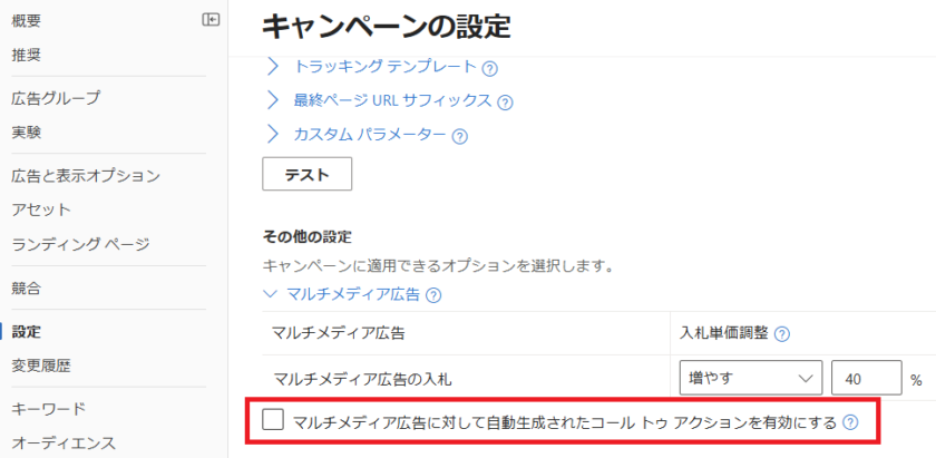 管理画面の左側メニューの[キャンペーン]にて該当のキャンペーンを選び、[設定] >[マルチメディア広告に対して自動生成されたコール トゥ アクションを有効にする]の項目のチェックボックスを外して「保存」をクリックする。